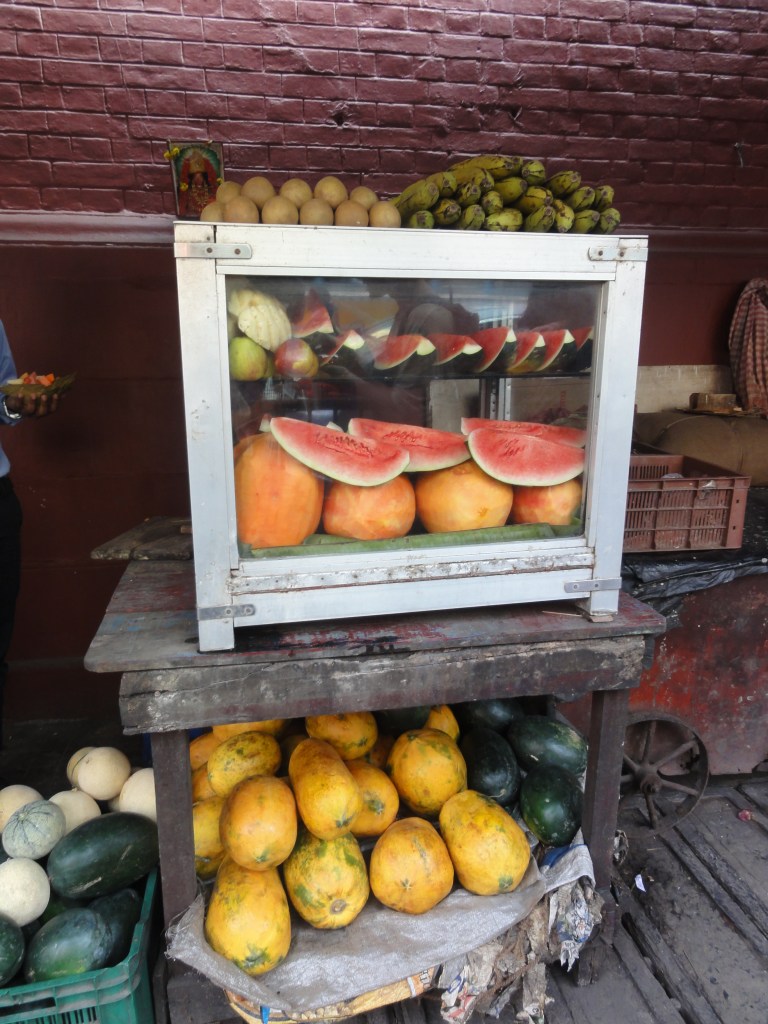Some people want selfies with us and we get an Uber to go back into some sort of center to try to find wifi. That seems to be a lost cause. We walk around for two hours or so before we give up and get some delicious street food! Restaurants and cafés are redundant in Calcutta, because there are sooo many people selling fruit salads, thali, poori, curries of different sorts, idli, dosas, chai, cakes, sweets, chapati, pakoras…. anything you could possibly want, except wifi. So we get chai first to kill the worst of the hunger, that has made me hangry, then we find a guy who makes a fruitsalad with chiko, apple, papaya, pineapple and some other fruit I don’t know the name of. He wants 20 rupees for all that! Then we find a guy who makes an egg sandwich for 30 rupees with a double egg. Then we get more chai! We do manage to find a phone doctor who managed to start my phone. The doctor gives my battery 30 days to live. That’s enough to write to Swapna at least and apologize for not seeing her in Chennai 😦